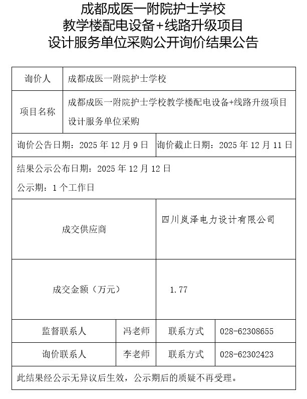 成都成医一附院护士学校教学楼配电设备+线路升级项目设计服务单位采购公开询价结果公告