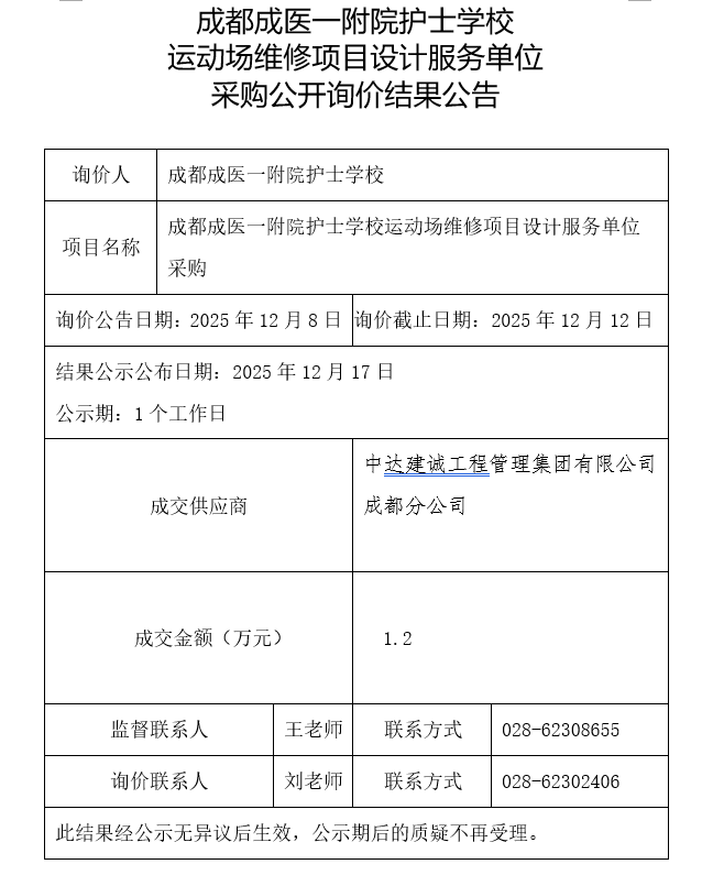 成都成医一附院护士学校运动场维修项目设计服务单位采购公开询价结果公告