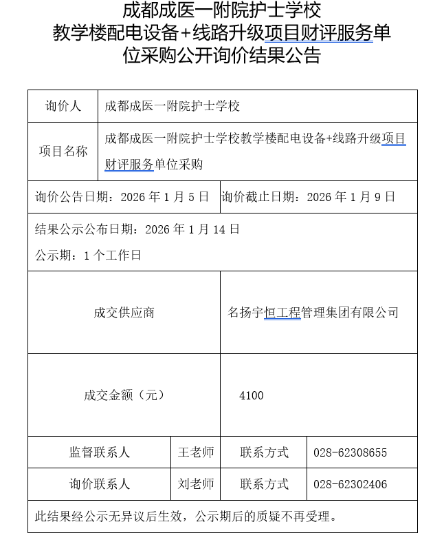 成都成医一附院护士学校教学楼配电设备+线路升级项目财评咨询服务单位采购公开询价结果公告