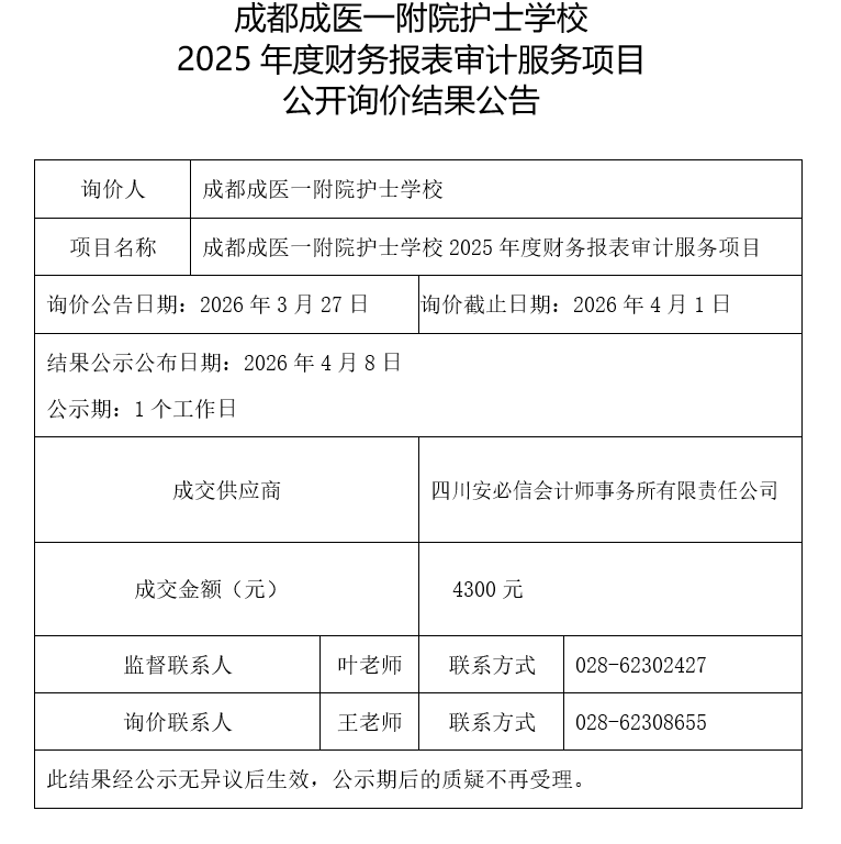 成都成医一附院护士学校2025年度财务报表审计服务项目询价结果公告